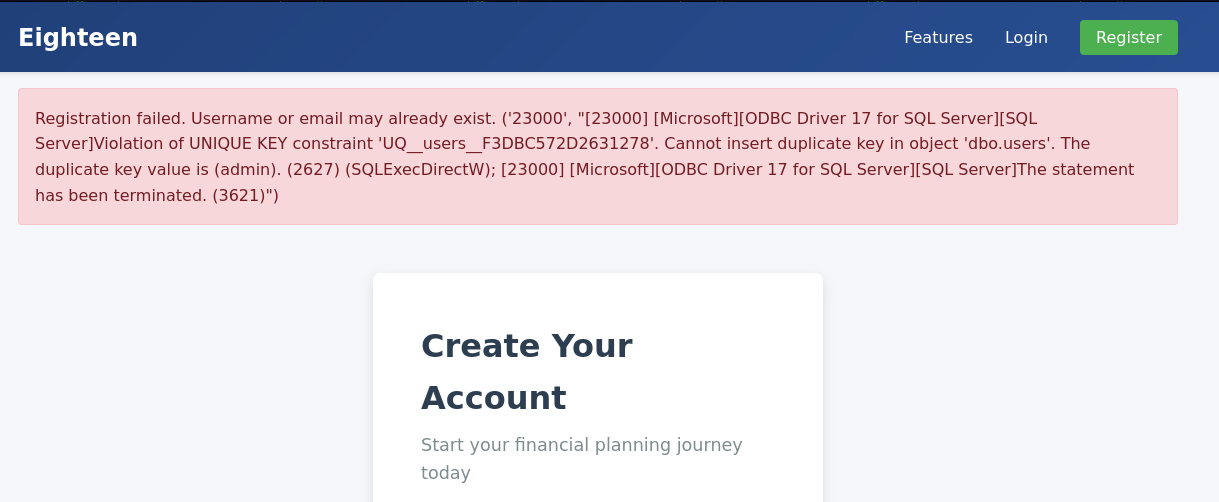 What we managed to find out is an error coming from the MSSQL when we try to register a user with the same username and thus we learned that an admin exists already!