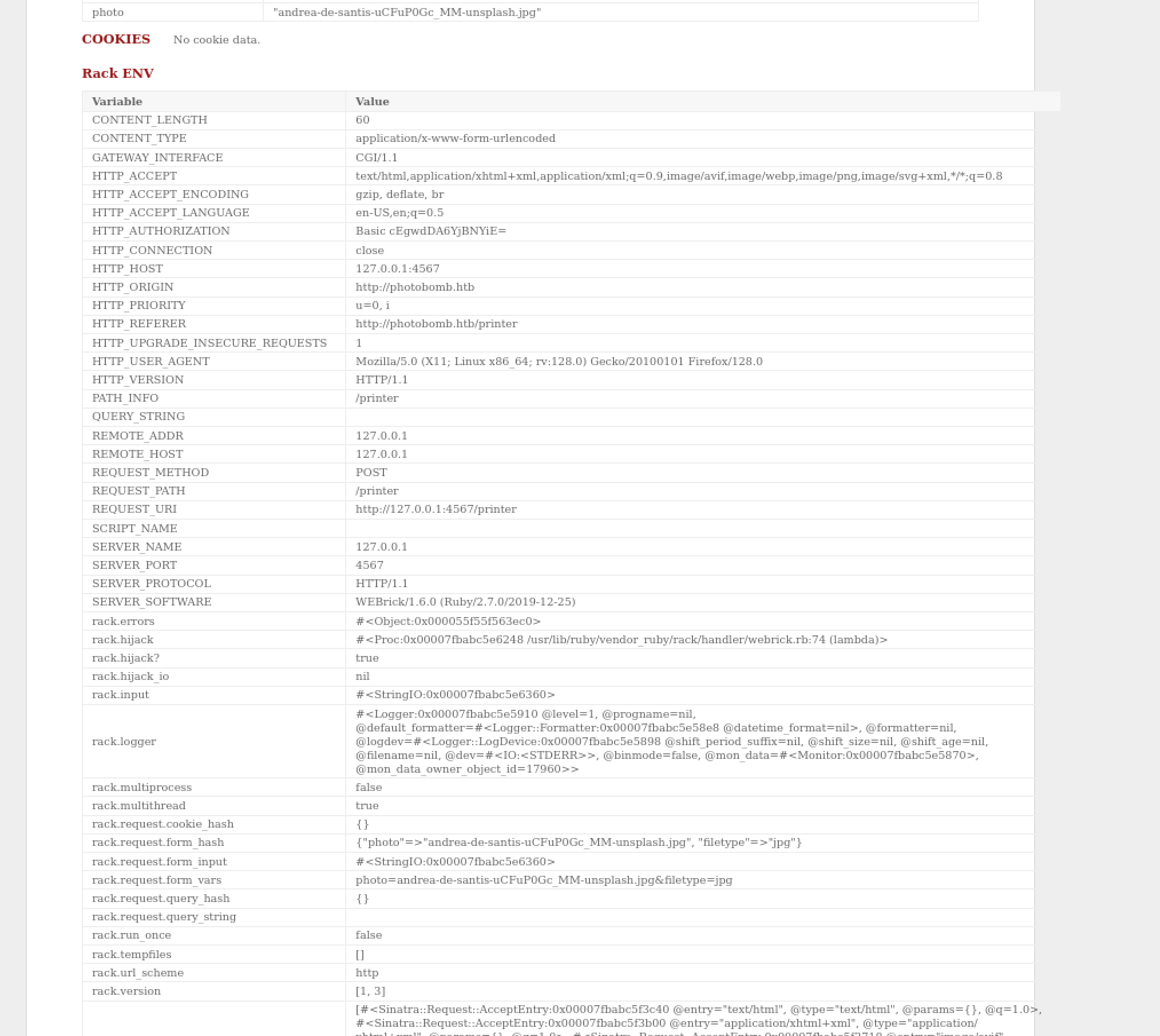 We see a web page that is about photography and has a link for a web (basic-auth) login modal. The path is /printer.